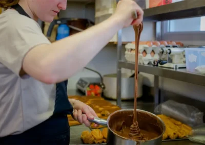 A part les barquettes traiteur, les beignets et les galettes de blé noir, tous les produits vendus en magasin sont conçus, façonnés et cuits maison.